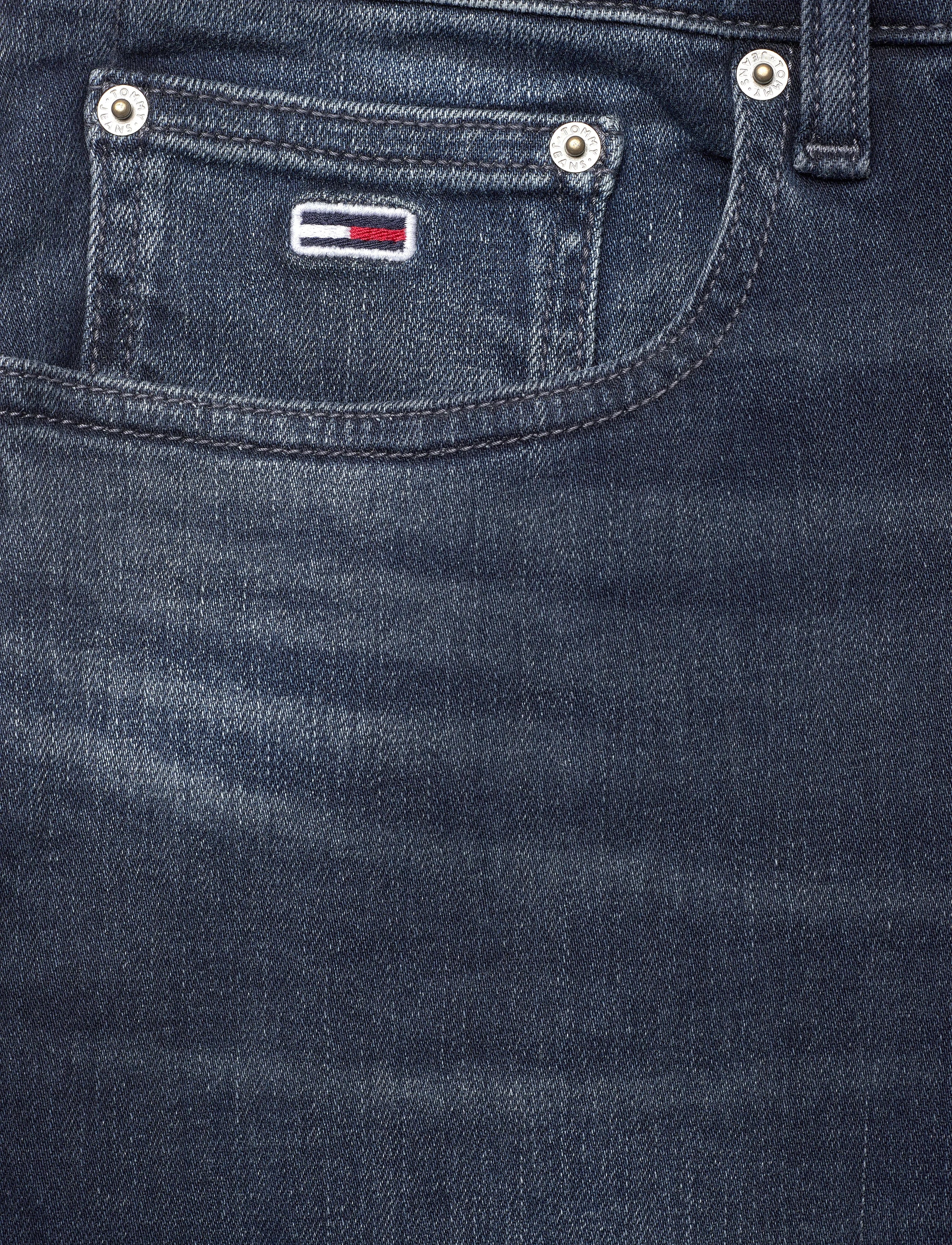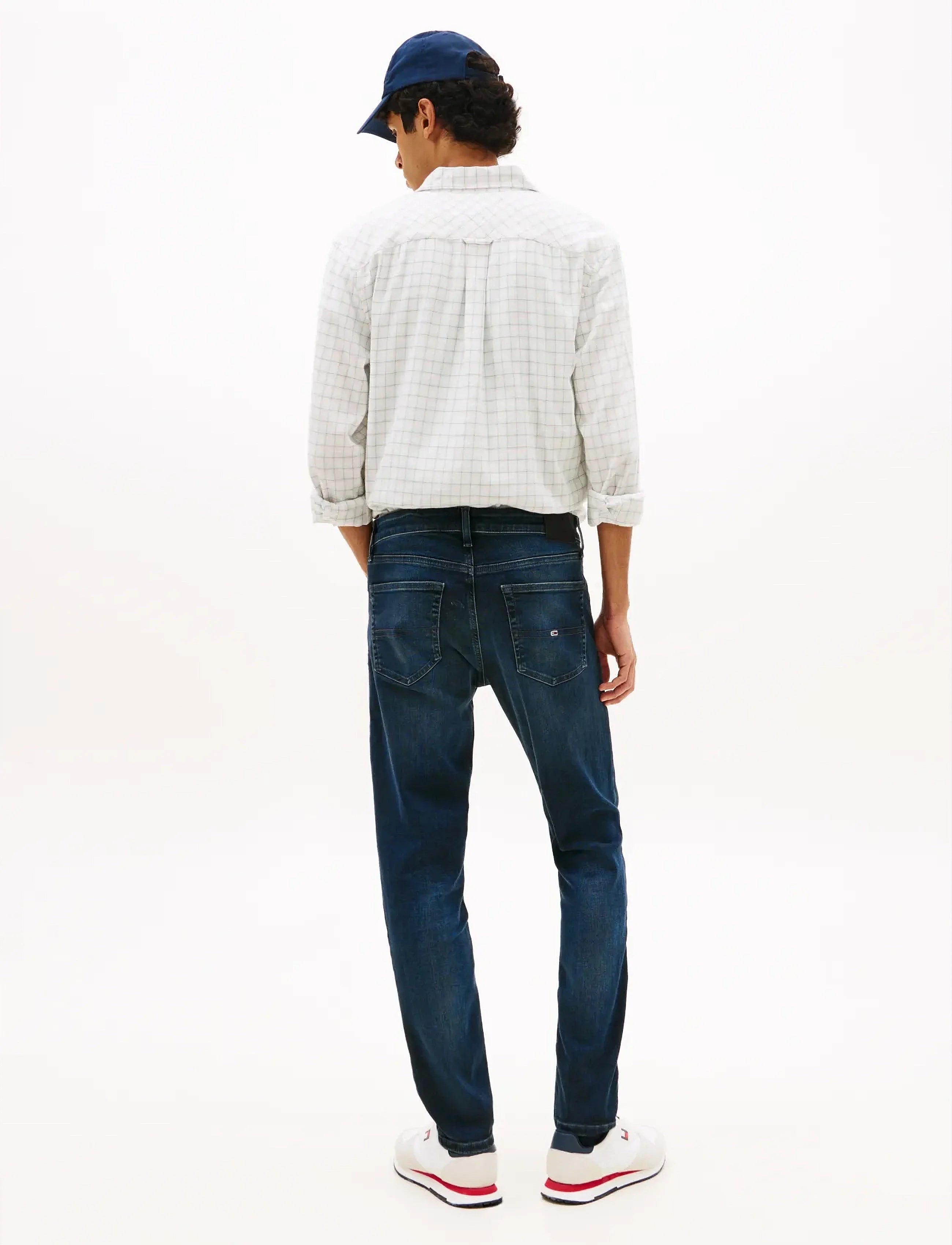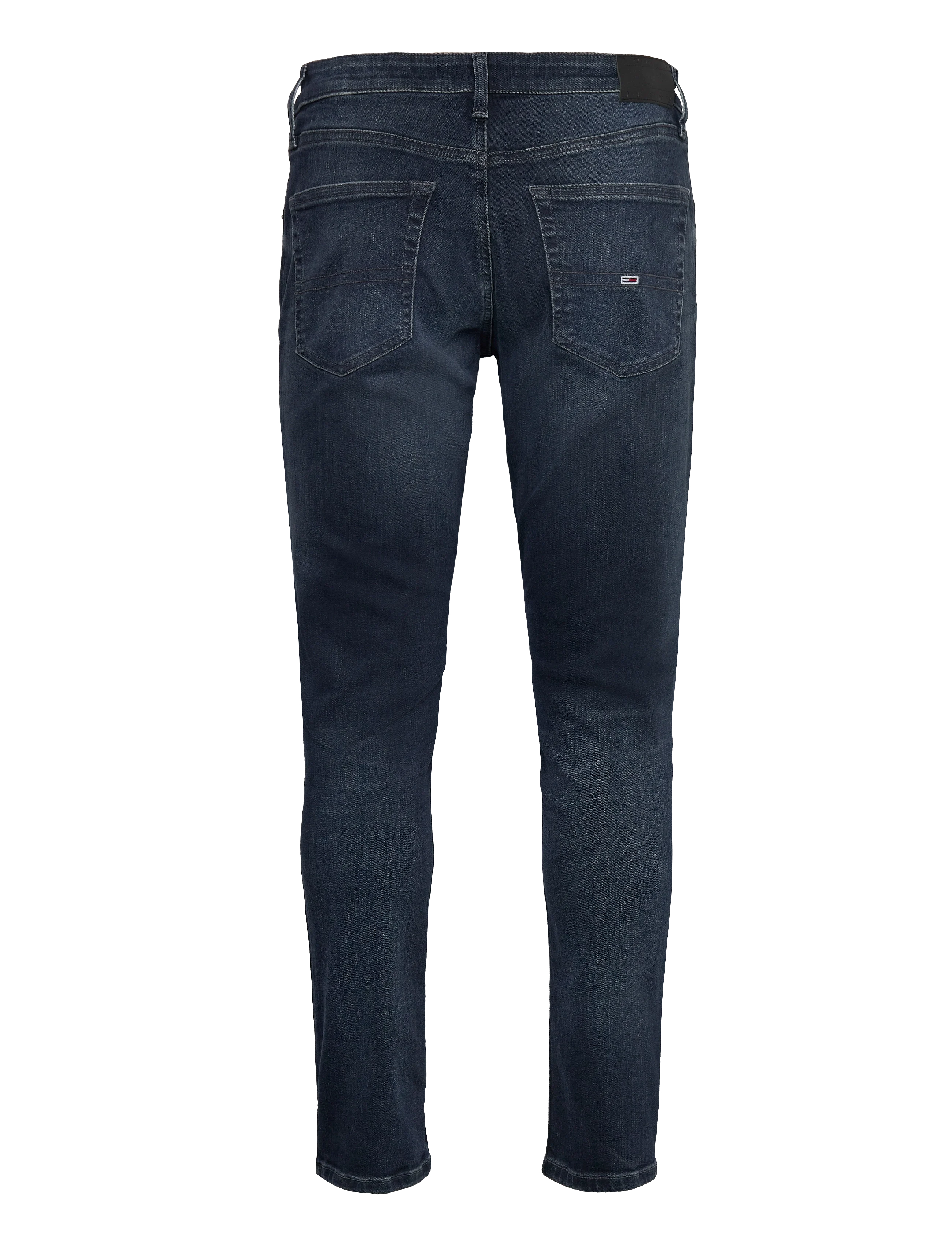 These Tommy Jeans offer a classic slim fit. They are made from durable denim. The jeans feature a five-pocket design. They have a comfortable waistband. These are perfect for everyday wear.