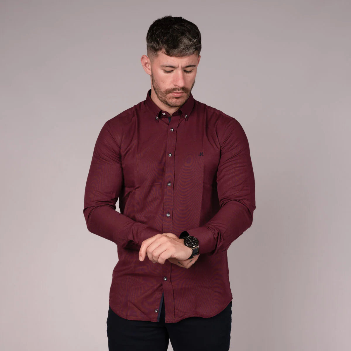 Plain long sleeve oxford cotton best seller shirt from Mineral. A comfortable, versatile, no-messing addition to any wardrobe. With button-down collar Contrast buttoning/inner cuffs